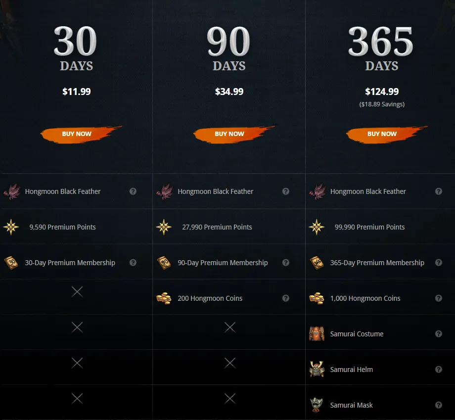 Пакет на 90 дней дополнительно к вышеупомянутому включает 200 монет Красной Луны (привет, дословный перевод). А пакет на 365 дней плюс к этому ещё и премиум-костюм Самурая.
