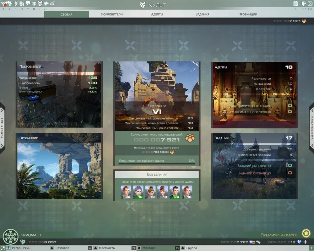 Культы называют одной из фич, но по сути это пассивная прокачка с тыканием в таблицы и применением лута, награбленного в приключениях, либо купленного в шопе. Не надейтесь увидеть забитые толпами фанатиков площади, праздники в вашу честь или иные приятные визуальные воплощения восхищения вашей персоной. Пантеоны - то же самое с поправкой на вклады гильдейских масштабов.