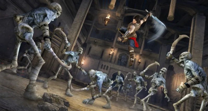 Что касается самих боев, то они должны драматически прибавить в масштабе. Вместе с громадными локациями нас ждут и многочисленные армии врагов (очевидно, в большинстве своем скелетов). В поединке с Принцем смогут сойтись сразу пятьдесят противников. Чтобы помочь нам расправиться с ними, разработчики ввели специальную систему контроля толпы. Суть ее в следующем. Драться персонально с каждым скелетом заведомо невозможно — придется выкручиваться в фирменном стиле. При помощи акробатики. Принц не может ставить блоки, зато освоил всевозможные откаты и защитные движения. Забудьте про неуместную слэшер-эстетику: знаковая сцена Forgotten Sands — та, где герой скользит в толпе скелетов, отталкивает их, пинает ногами, а потом пускает в ход магию. Судя по всему, даже крови не будет. В конце концов, любой Prince of Persia — он, как и 20 лет назад, в первую очередь про то, как красивый мальчик в белых штанах спасает Принцессу