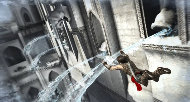 Помимо управления временем Принц обучился контролю над стихиями. Если заморозить струю фонтана, из нее получится отличная колонна, по которой можно взобраться; глубокий канал станет твердым катком, а струйки оросительных сооружений мгновенно превратятся в перекладины, на которых удобно раскачиваться. Все это, конечно, мило, но отнюдь не ново. А теперь представьте, что произойдет, если этот «стихийный» геймплей разогнать до привычных сверхзвуковых скоростей Принца!