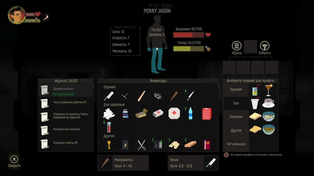 В инвентаре из собранных предметов можно создать новое мощное оружие или скомбинировать необходимые вещи: лекарство, еду или более сложные устройства. Также повысить уровень своего жилища: а именно, улучшить в нем кровать, кухню, верстак или защищенность двери. Прочитать подобранные записки, что открывает подробности произошедшего.