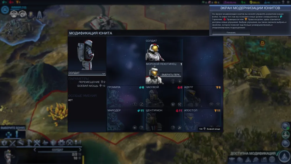 Ещё один аспект, на который оказывает влияние Совершенство и который является продолжением истории с прокачкой юнитов – апгрейд юнитов. Абсолютно у всех боевых юнитов в игре есть экран модификации, где можно выбрать направление развития юнитов, а также особое умение.