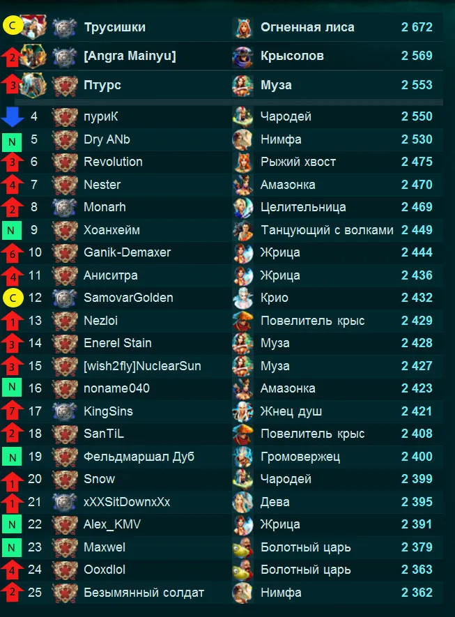 17) Аж 40 рейтинга удалось набрать бывшему мощь-абузеру KingSins, теперь это другой человек, фул-фиоловый +5 жнец и в соратниках игроки с рейтингом не ниже 2000.