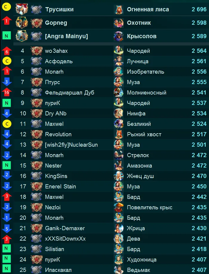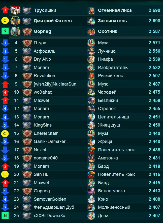 16) А вот Ganik-Demaxer со своей Жрицей пал ещё ниже на 5 строчек, потеряв 7 рейтинга и по сути делит с Музой одно место.