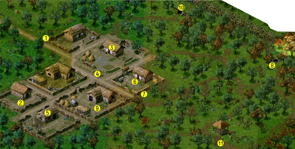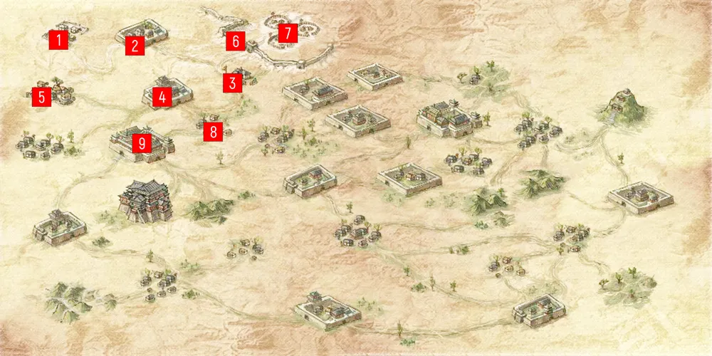 1 – переход в префектуру Бэйди. 2 – ворота лагеря. 3 – дровосек. 4 – вход в пещеру. 5 – шатер императора. 6 – переход в Саньян.