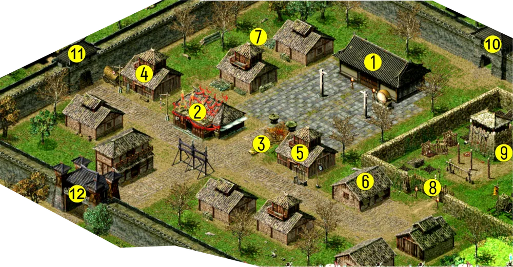 1 – штаб. 2 – таверна. 3 – торговец овощами. 4 – бакалейная лавка. 5 – кузница. 6 – дом ученого. 7 – плотник. 8 – вход в тюремный двор. 9 – тюрьма. 10 – переход к перевалу Яньмень. 11 – переход в Чжаоцунь. 12 – переход в префектуру Бэйди и к курьерской станции Бэйди.
