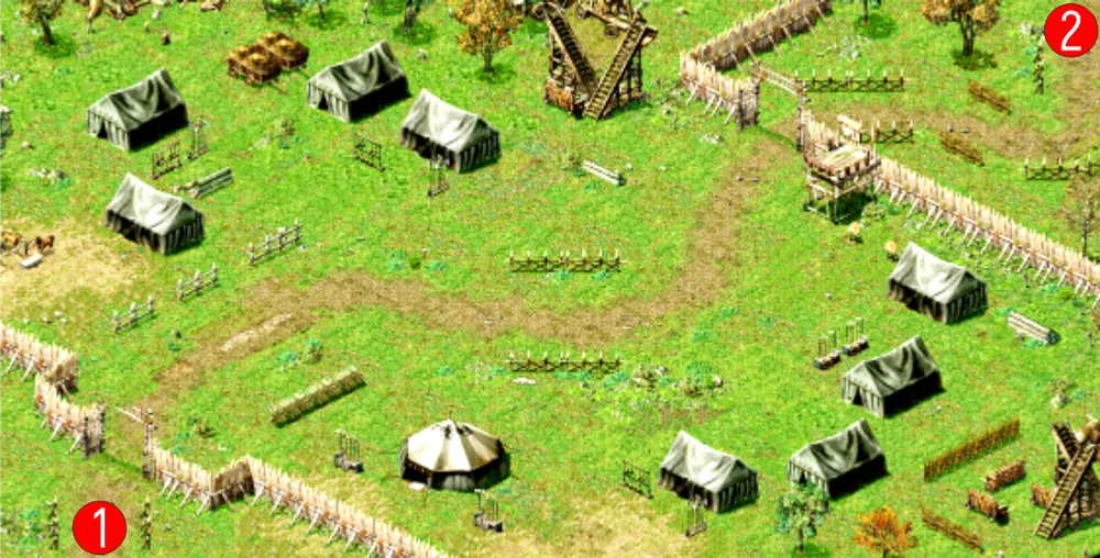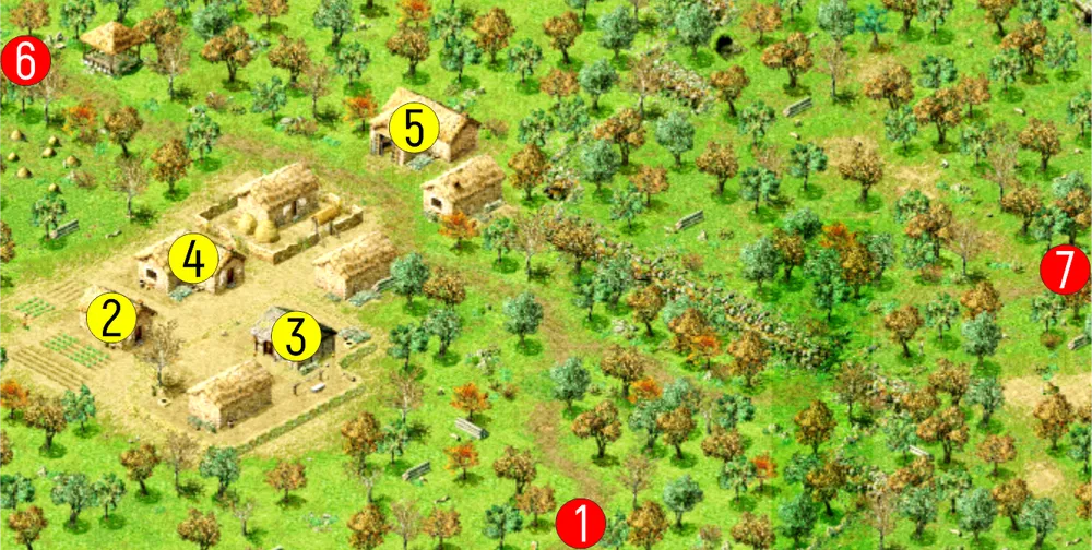 1 – переход в деревню Сишуй. 2 – оружейник. 3 – лавка. 4 – привратник. 5 – заброшенный дом. 6 – вход в пещеру. 7 – курьерская станция. 8 – таверна. 9 – резиденция командира. 10 – Гань Пэй. 11 – Ху Дао (появится после встречи с грабителем). 12 – дом Мао Линя. 13 – дом Лань Эра. 14 – жена У Чэня (появится после первого разговора с Цай Цы). 15 – Переход в Ханьдань.