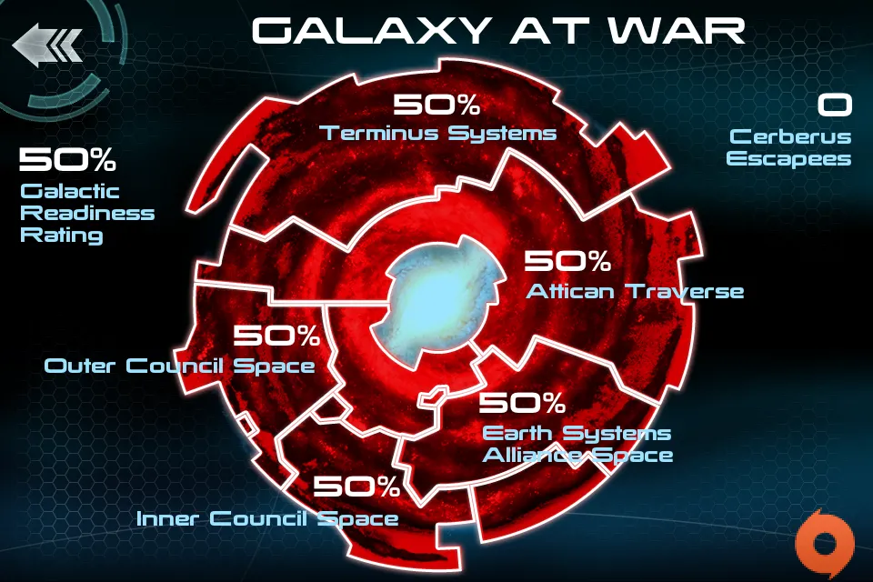 Тот самый трофей, который требует активации Online Pass в консольной версии. Готовность галактики — это модификатор, выраженный в процентах, который показывает общую боевую готовность войск, что влияет на "истинную" концовку и на достижение «Капитан Галактики». В сингле никак повлиять на готовность нельзя, так что придется идти в мультиплеер и играть случайные битвы на бронзу. Каждая битва повышает готовность на 3-5%, всего нужно поднять с 50% до 100%, одна мультиплеерная битва длится около 20 минут — вот и считайте затраты.