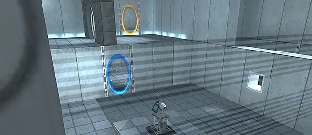 Голос приветствовал меня: Добро пожаловать в компьютизированный экспериментальный центр при Лаборатории Исследования Природы Порталов. Мы надеемся, что ваше кратковременное пребывание в камере отдыха доставило вам положительные эмоции. Анализ особенностей вашего организма завершён. Мы готовы приступить к опытам. Перед началом тестирования хотим вам напомнить, что, хотя основным принципом экспериментального центра является обучение в игровой форме, мы не гарантируем отсутствие увечий и травм. Из соображения вашей безопасности и безопасности окружающих воздержитесь дотрагиваться до... Por favor bordon de fallar Muchos gracias de fallar gracias... чего-бы то ни было вообще. Приготовьтесь к открытию портала. Три. Два. Один.
