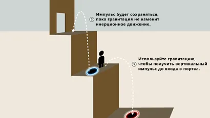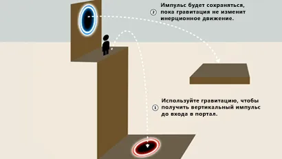 Особенность такого ускорения в том, что оно приобретается при скачке между порталами одного цвета — вылетая из оранжевого портала, мы опять же влетаем в оранжевый, но созданный уже в месте падения.