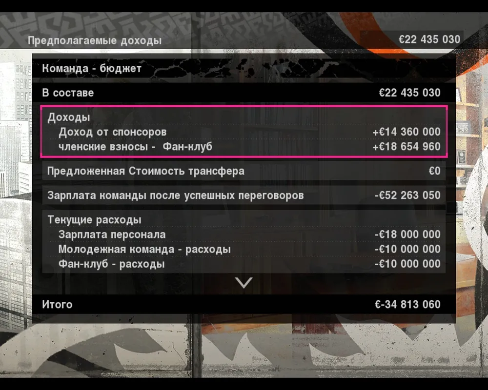 Заключив контракты со своими футболистами, подобрав хороших спонсоров, назначив зарплаты обслуживающему персоналу, вы можете взглянуть на положение финансовых дел клуба, перейдя в раздел Предполагаемые доходы. В нем можно увидеть ожидаемые доходы команды, расходы и зарплату игроков. Внизу подбивается своеобразное сальдо, которое может быть плюсовым или минусовым. Если у вас минус, то нужно либо сокращать расходы, либо же где-то брать деньги. Одним из хороших источников необходимых денег является трансферный рынок, где вы всегда сможете продать некоторых своих игроков за хорошие деньги и таким образом изменить свой баланс на положительный. В этой своеобразной бухгалтерском отчете можно кликнуть по любой статье расходов или доходов и тогда нам откроются подменю из которых положение дел можно изменить.