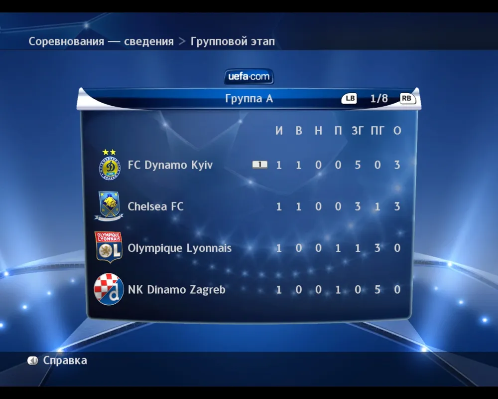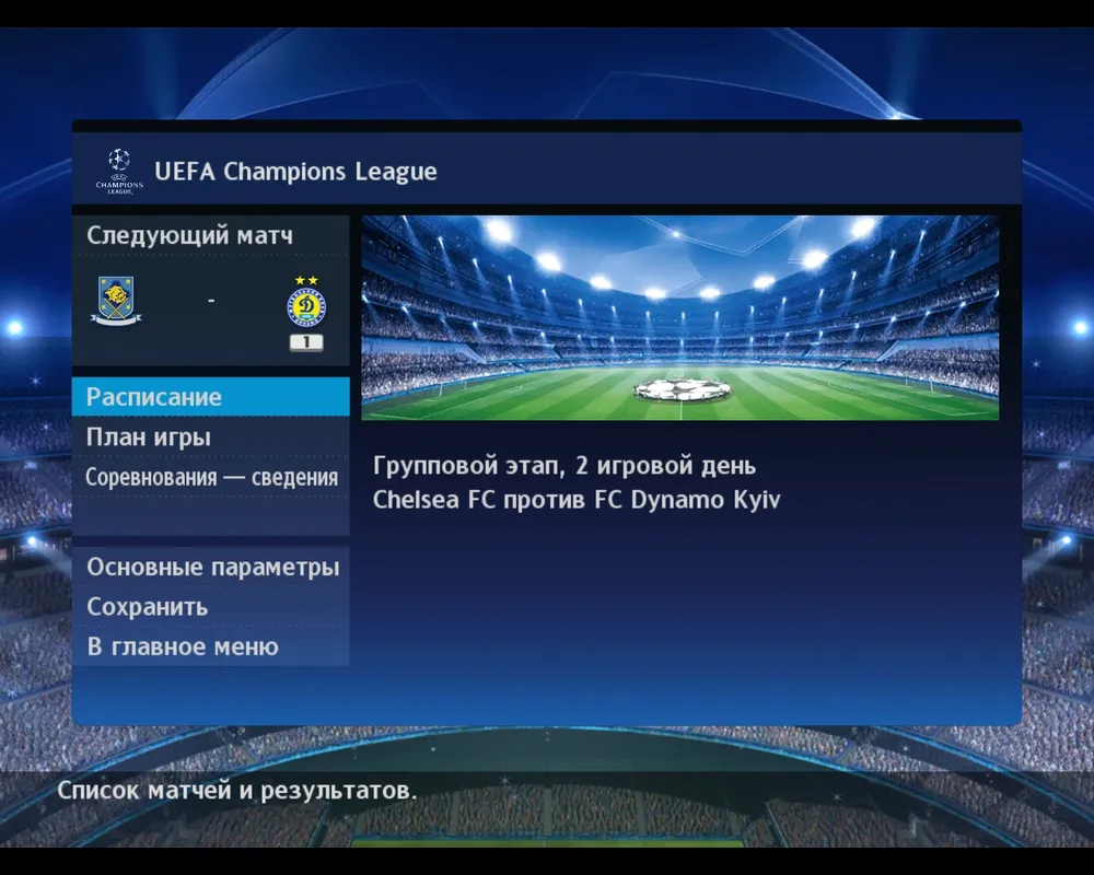 Пройдя тот же этап начала карьеры, что и в Лиге-Кубке, тоесть выбрав число игроков, команды, определив разбиение команд по группам (здесь можно оставить автоматический выбор либо немножко подкорректировать самому), и выставив сложность игры, мы оказываемся в главном меню турнира, которое окрашено в приятный голубой оттенок Лиги Чемпионов.