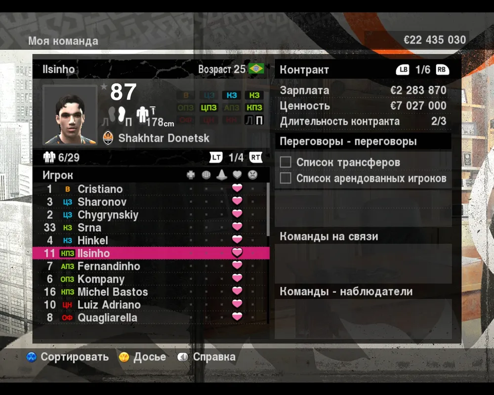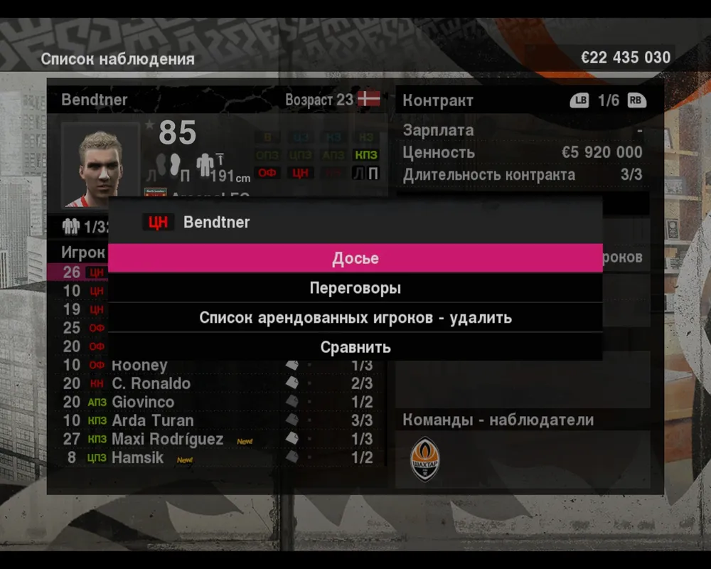 Если активировать любого игрока из списка, то откроется подменю в котором у вас будет возможность посмотреть досье футболиста, разорвать с ним контракт, выставить на трансфер, или предложить для аренды.