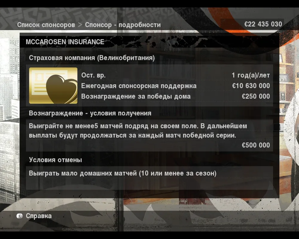 Понято, что для создания и развития собственной команды вам понадобится много денег. Часть из них поступает за входные билеты, часть за победы в турнирах, но львиную долю доходов команды в PES 2010 вы получите от спонсоров. В подменю Список Спонсоров отображены все финансовые благодетели, которые есть у команды на сегодняшний день и основная сумма денег которые они выплачивают команде. Активировав любого из них, вы сможете увидеть более подробную информацию о ваших «денежных мешках». Да, в карточке каждого спонсора отображается количество времени до истечения контракта, основная сума спонсорской поддержки (то есть то что стабильно выплачивается каждый год), вознаграждение за победы дома, дополнительное вознаграждение и условия его получения (такими может быть победа в чемпионате, проход в еврокубки, выход в плей-офф в Лиге Чемпионов и много другого), а также условия отмены контракта (на это нужно обращать особое внимание, так как подчас условием отмены может быть непостоянная игра в основе одного из футболистов или его продажа). Спонсоры заключают новые контракты в начале сезона, и чем лучше выступает команда, тем больше их у нее. А соответственно и больше денег.