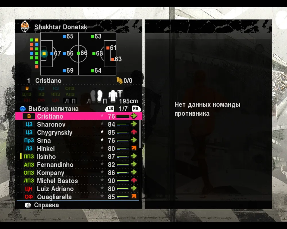 Стартовый состав. Собственно главное меню для выбора того кто будет играть за основную команду. Здесь представлены все футболисты которые есть в вашем распоряжении, в верхней части основная команда, нижней запас, и самый низ глубокий резерв. Каждый футболист имеет общий скилл (кстати это новшество в PES) который определяет его уровень. Он образуется из среднего значения параметров которые более важны на игровой позиции и меняется в зависимости от того на какой участок поля вы поставите игрока. Если форвард имеет скилл 80, то поставив его центральным защитником, его скилл может упасть до 35-40. Также напротив игрока отображается накопленная усталость и физическое состояние. В момент наведения курсора на интересующего нас футболиста сверху, под тактический схемой, отображается его рост, игровая нога, любимый фланг, и позиции на которых он может играть. Если говорить о позициях то раньше было намного легче определить правильное место на поле для футболиста, ведь прямо на тактической схеме отображался участок поля на котором он может играть. В PES 2010 этого нет, что заставляет более подробно изучать каждого игрока. Чтобы увидеть подробные данные по каждому футболисту нужно с помощью Left Bottom или Right Bottom прокрутить список, где можно просмотреть конкретные показатели для каждой способности, возраст, уровень травматизма и индекс игрока. Также выбирая игрока, мы видим его уровень сыгранности с партнерами на тактической схеме.