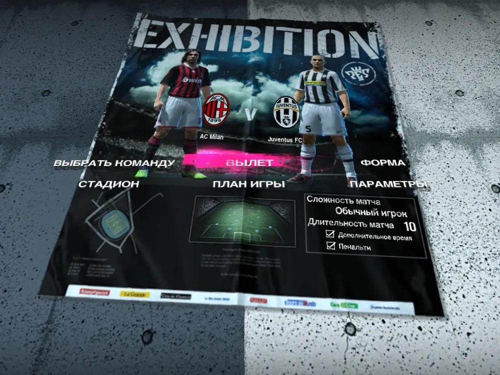 После нажатия Демонстрации мы очень плавно, каким-то совершенно незаметным движением перемещаемся к возможности выбора способа игры. Это кое-что новое в PES и оно предлагает нам следующие возможности: игра против ИИ (собственно компьютера), против игрока (тут вам понадобится второй джойстик) и пользовательская настройка которая позволяет нам увидеть привычное с PES 2009 меню, где можно выбрать за какую сторону играть и режим игры (игрока или тренера). В моем случае нажимаем против ИИ и видим как на футбольной площадке оказывается футбольный журнал на котором изображены ведущие футболисты команд соперников и на манер заголовков в том же журнале подпункты меню с возможностью выбора команды, стадиона, формы, определения параметров и плана игры. Большинство этих пунктов схожи с теми, что были в PES 2009, никак не отличаются функционалом, а только лишь стилизацией. Но давайте рассмотрим каждый пункт в отдельности.