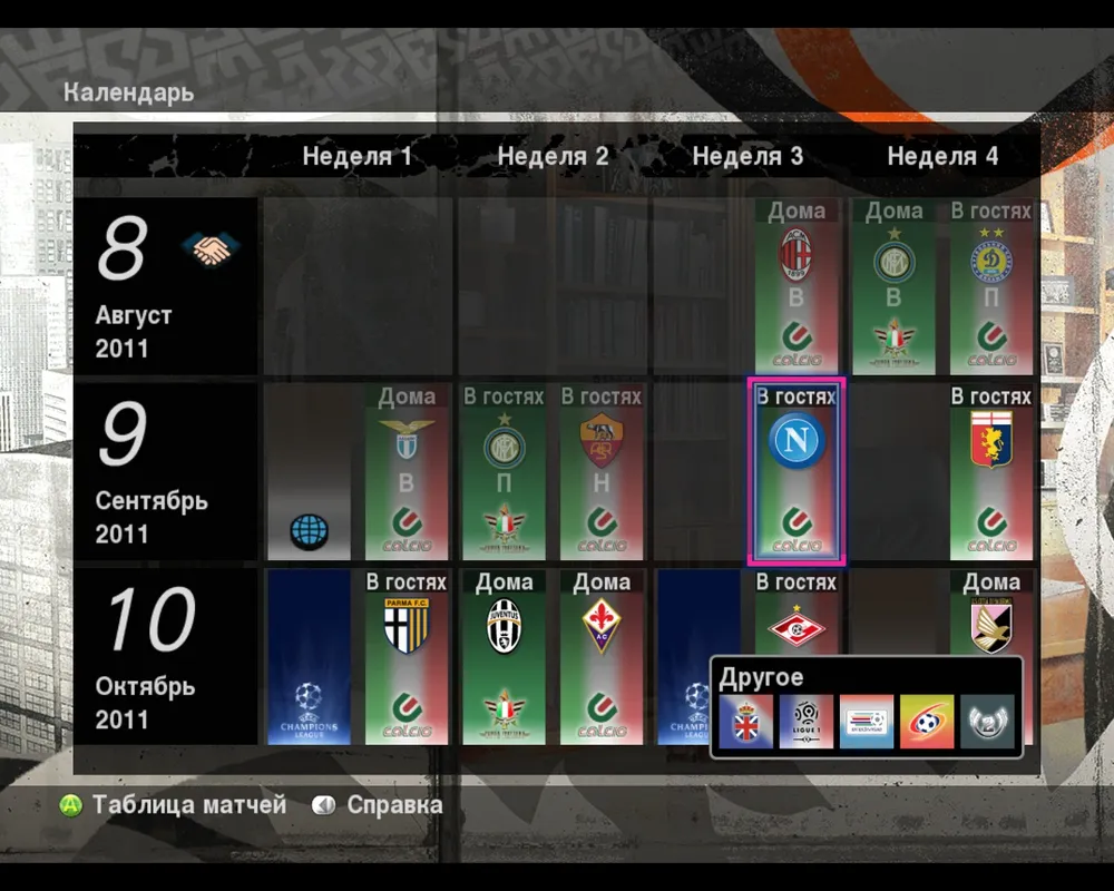 Календарь немного отличается от того какой мы видели в Мастер-Лиге. Здесь время считается не по месяцах, а по неделях, от 1-й до 52-й. В остальном так же нажатием на клеточку с матчем получаем информацию о всех поединках в этот игровой день.