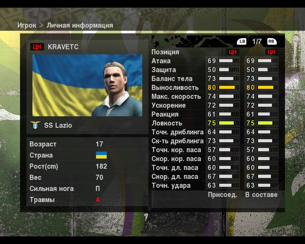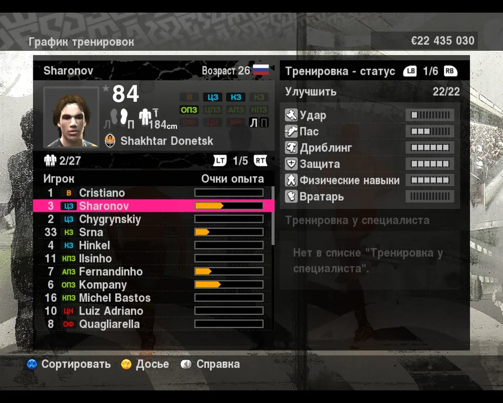 Первое что вам предполагается посмотреть в Игроке это Личная информация. Здесь все стандартно, красочно отображена ваша фотография на фоне национального флага, показаны общие параметры, которые можно прокручивать теми же Left Bottom и Right Bottom. Здесь также можно увидеть имеющиеся карточки игрока, и график развития.