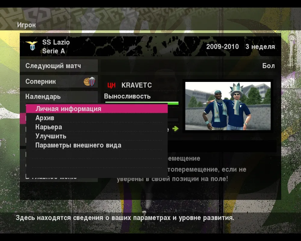 Если в Мастер-Лиге меню было кардинально переработано, то в Легенде все оставили на своих местах. Да, мы видим знакомое нам разделенной на следующие подблоки в левой части меню: все что относиться к матчу, управление футболистом, и параметры. Справа небольшая картинка, на которой появляются злободневные сюжеты, отображение физического состояния игрока (вот это едва не единое новшество в режиме Легенды) и сообщения на разную тематику.