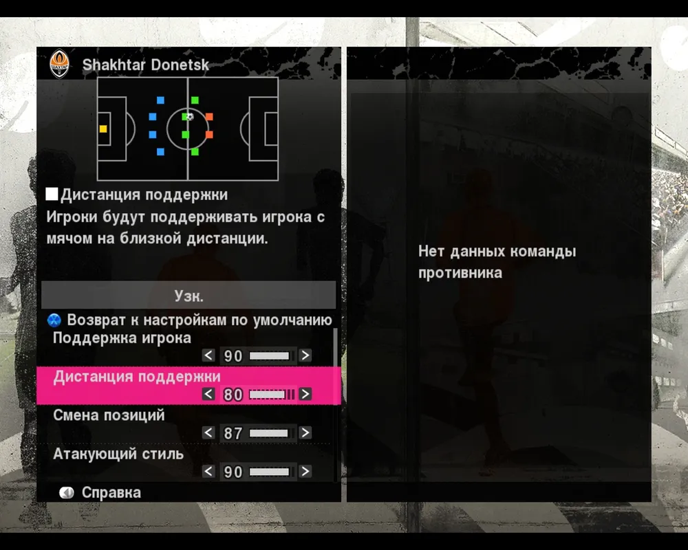 - Дистанция поддержки – параметр указывающий насколько близко игроки будут находится возле футболиста с мячом. Данное значение полезно увеличить, если ваша команда играет в короткий пас, часто использует «стенку» и атакует большими силами.