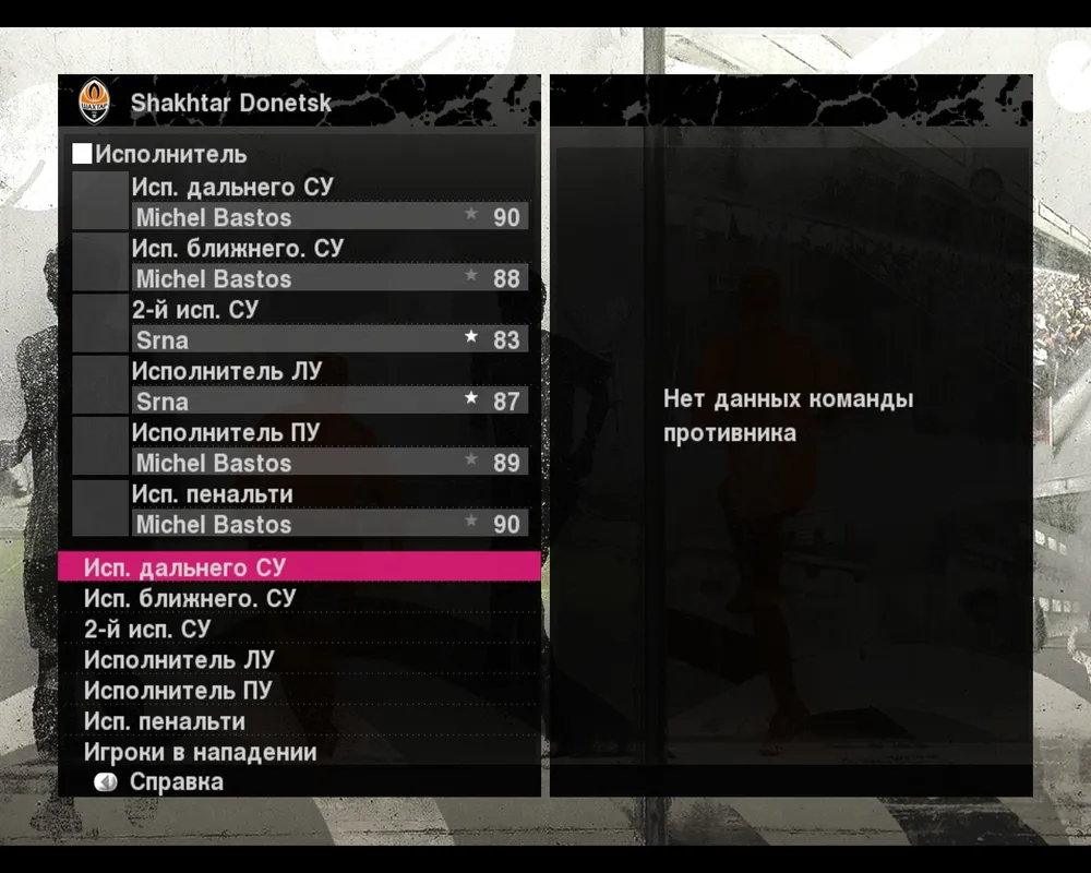 Ну и конечно нельзя забывать про стандарты. В плане игры есть пункт параметры, где можно назначить исполнителя любых ударов. Собственно здесь можно указать, кто будет пробивать пенальти, штрафные и подавать угловые. Несложными манипуляциями устанавливаем на стандарты нужных нам футболистом и идем дальше.