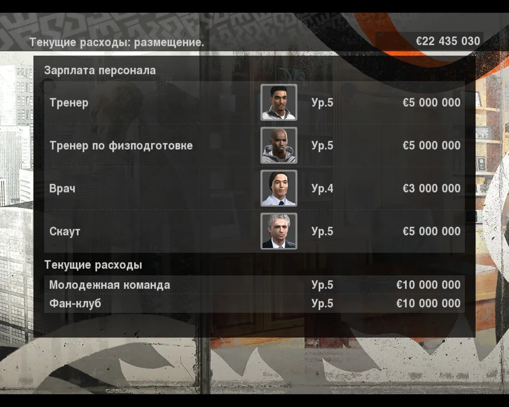 В PES 2010 вы можете контролировать свои затраты, зайдя в меню Текущие расходы. Здесь отображены зарплаты тренерам, врачам, скаутам, выплаты на молодежную команду и на поддержку фан-клуба. Эти затраты в начале сезона можно уменьшать или увеличивать, соответственно будет меняться и качество работ произведенных данными специалистами. Так что на этом лучше не экономить и постараться как можно скорее нанять хороших работников, пусть они и потребуют много денег. Качественная игра команды для нас несомненно важнее