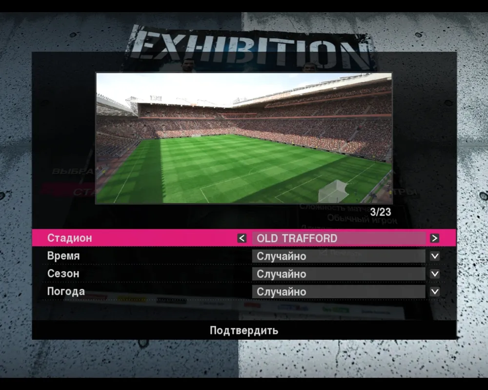 Как видите меню сразу встречает нас кардинально переработанным дизайном если сравнивать с PES 2009. Лично мне понравилась и наклонная плоскость футбольной площадки выложенной из асфальта, и нарисованные Торрес с Месси застывшие в борьбе за мяч, и красивые буквы, парящие над ними. Когда мы переводим курсор на очередной пункт меню он подсвечивается движущейся фиолетовой лентой, что создает очень красочный эффект своеобразного горения. Этот же эффект присутствует во всех разделах игры, только цвет подсвечивания может меняться. Практически все пункты главного меню не изменились и остались теми же, что в предыдущей версии. Но мы, в надежде на изменения внутреннего составляющего игры, кликаем по Демонстрации. Собственно я всегда начинаю с этого пункта – ведь первый матч должен быть не в рамках какого-то турнира, а просто оценивающим.