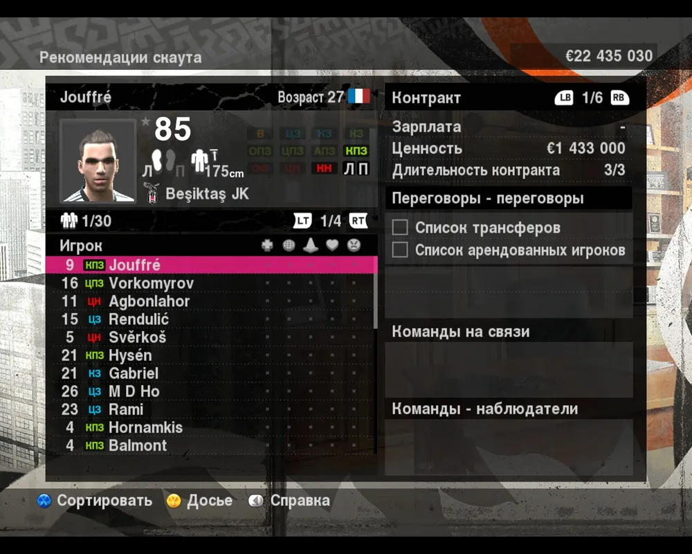 При наведении курсора на игрока, в верхней части левой стороны экрана мы можем увидеть фотографию футболиста, его общий скилл, национальность, возраст, рост, позицию и игровую ногу. В правой части экрана можно просмотреть информацию, связанную с контрактом игрока – его зарплату, ценность, длительность контракта, список команд, которые наблюдают за ним, и которые ведут переговоры, а также не выставлен ли игрок на трансфер или для аренды.