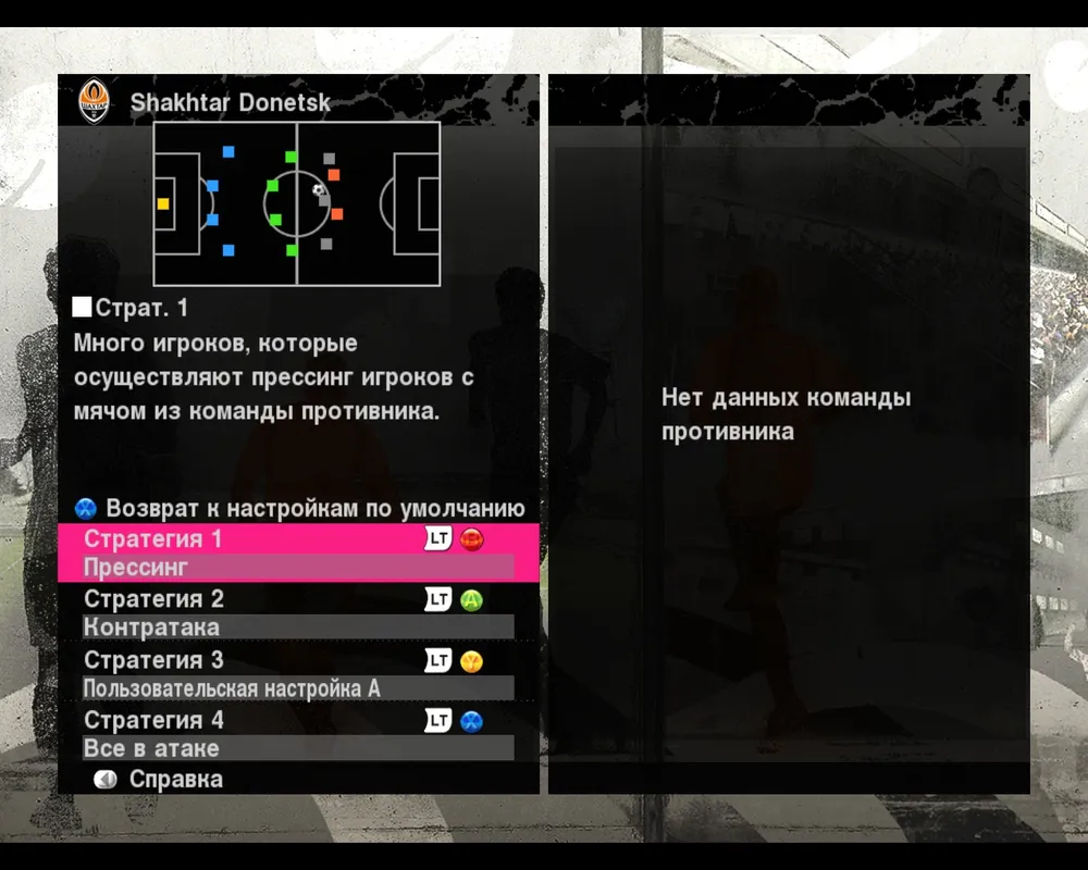 С тактикой мы разобрались, теперь давайте перейдем к стратегии, которая отыгрывает не меньшую роль в удачных выступлениях вашего клуба. Она позволяет корректировать действия команды, не прерывая футбольный поединок. На горячие клавиши назначается любая на выбор стратегия (прессинг, контратака, защита, полное нападение и др.) и задействовавши их вы можете изменять ход поединка по его ходу. Также здесь существует параметр называемый пользовательская настройка, в которой вы можете установить абсолютно новую тактическую схему подходящую для того или иного момента, и переключится на нее по ходу поединка.