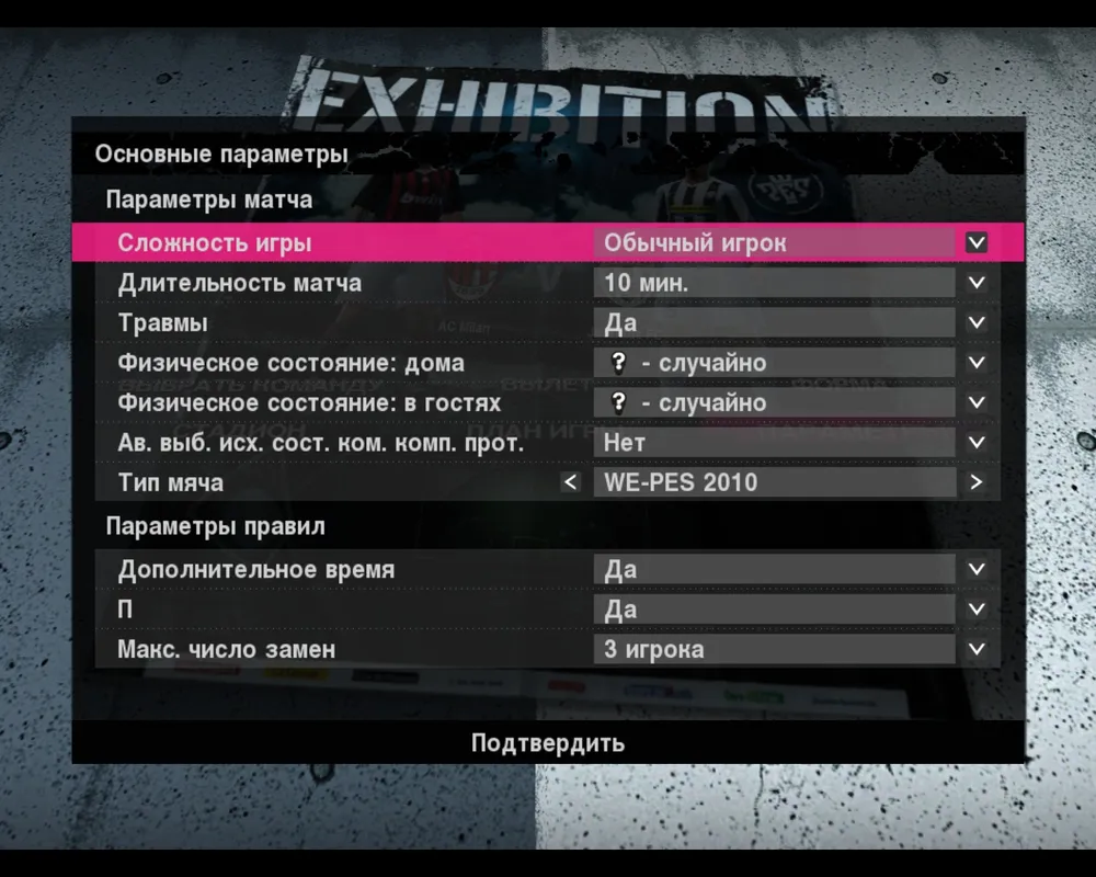 - физическое состояние – как дома так и в гостях можно настраивать физическое состояние своих игроков, выбирая из следующих кондиций: отлично, хорошо, нормально, плохо, ужасно. Также у вас есть возможность установить параметр случайно, и предоставить выбор компьютеру;