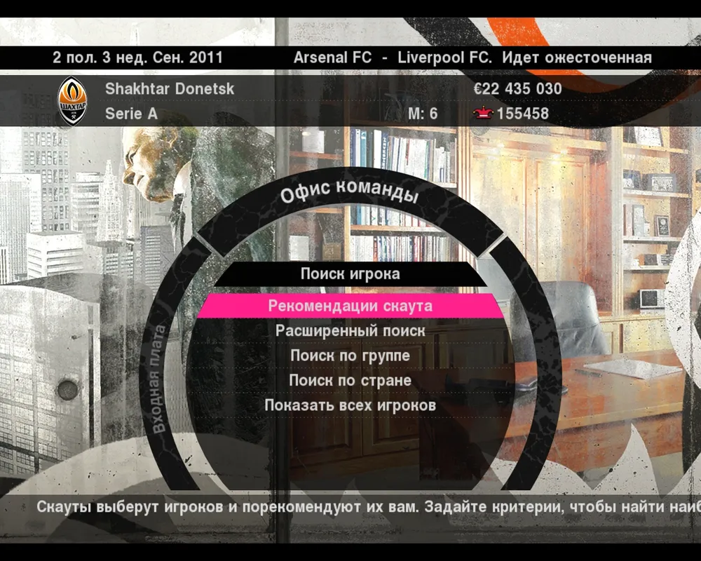 Поиск нужного вам футболиста может проходить по-разному. Например, его вам может порекомендовать скаут. За это отвечает пункт меню Рекомендации скаута. Здесь можно выбрать характеристику, по которой скаут будет проводить поиск (тактическое соответствие, открытость к переговорам, или перспективные игроки) и он тут же выдаст вам список футболистов подходящих под эти параметры. Их можно отсортировать по стоимости, имени, рейтингу или возрасту и подобрать наиболее подходящего под тактическую схему команды.