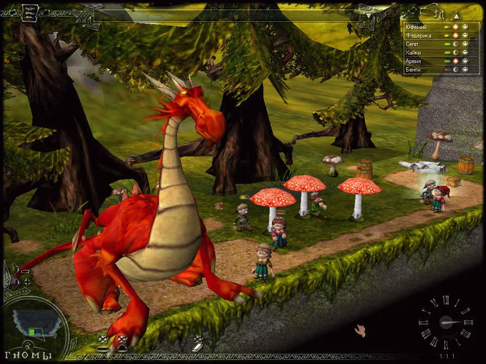 После того, как картины будут правильно размещены, откроются обе двери. Дверь налево ведёт в сокровищницу, набитую золотом. А в одной из бочек будет гиперболоид. Ша, чего обрадовались? Это не оружие, а местный аналог отбойного молотка. Не всё же кайлой махать!!! Дверь направо в конечном итоге приведёт вас в деревню умников. Недалеко от этой деревни все ваши гномы-мужики загадочным образом исчезнут. Причём без своего инвентаря! Не забудьте его захватить с собой! Придётся работать только женщинами.…Ну, ничего. Справимся.… Спускайтесь в самый низ деревни умников. Прямо к какому то странному агрегату. Да, чуть не забыл, перед этим соберите все пожитки и как можно больше еды. Проследите, чтобы у всех гномих было оружие! Это важно. Итак, в этом самом зале вам подробно объяснят, что случилось с вашими мужиками. Конечно эта Лорили гадюка, ведьма, карга и редиска.
