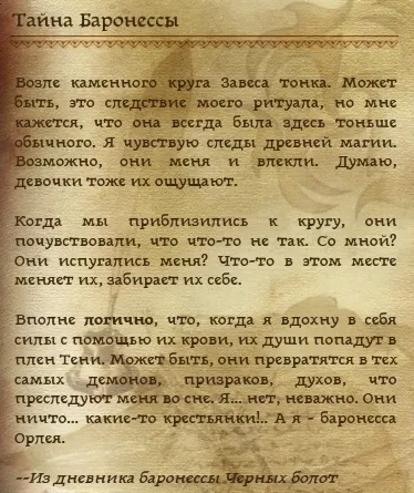 В самом склепе обитают скелеты (странно, правда?), любящие нападать волнами, а выход из него находится к югу. У ворот деревни вас встретит стражник, который убедит вас, что тут тоже что-то не так. У ворот поместья соберется вооруженная и разъяренная толпа, под предводительством упомянутого стражником духа. Он назовет свое имя – Справедливость, после чего предложит помочь ему разобраться с баронессой-угнетательницей. Вы сможете выбрать, на чьей стороне выступать – наглой магички, или затянутых ею в Тень неповинных крестьян.
