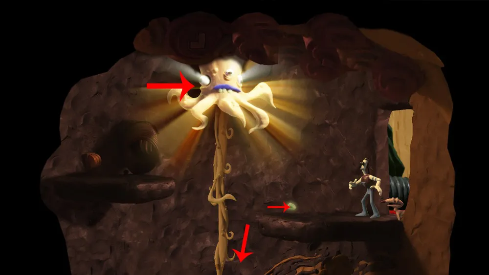 Ползем Клювиком по очередному туннелю и выходим с обратной стороны. Дальше у меня возникла сложность, потому что я реально не мог понять, что от меня требуют. На самом деле надо кликнуть по тому существу-осьминогу, которое исполняет в этой игре роль лифта и начнется ролик. Каким образом я должен был до этого додуматься, знают только те, кто делал данную игру, и они подобное действие провернут еще не раз.
