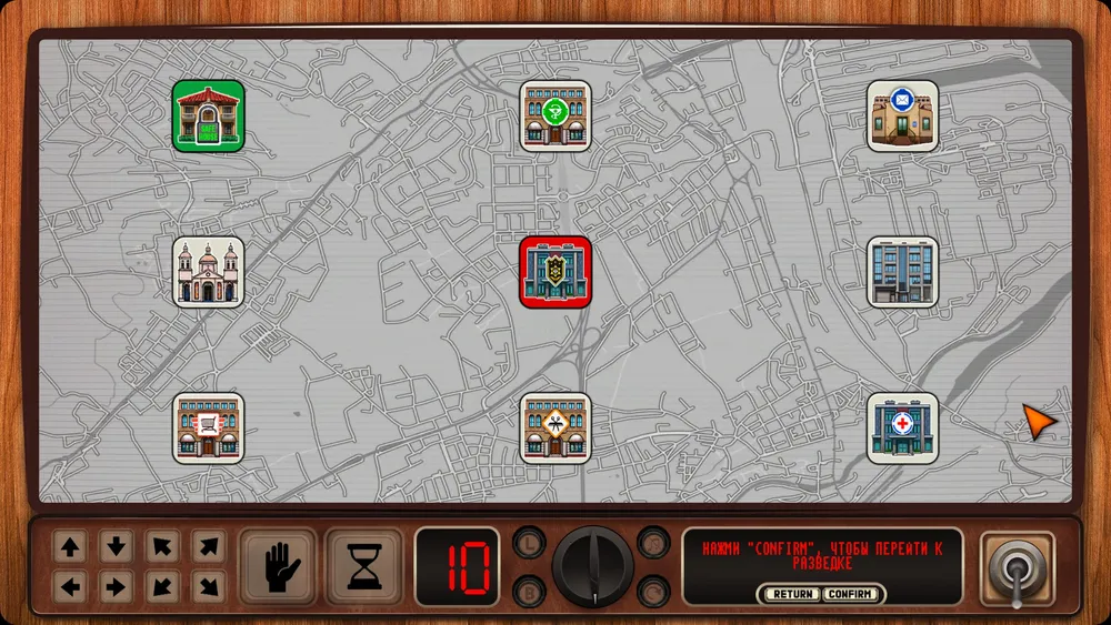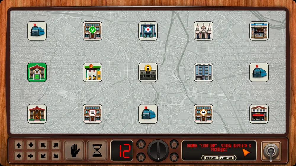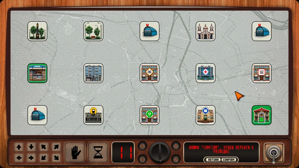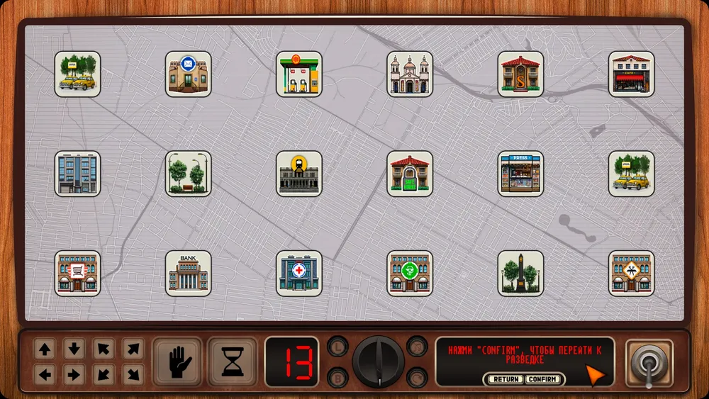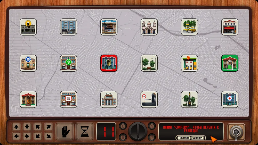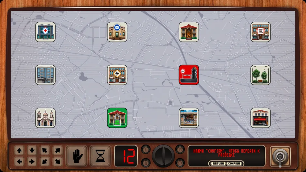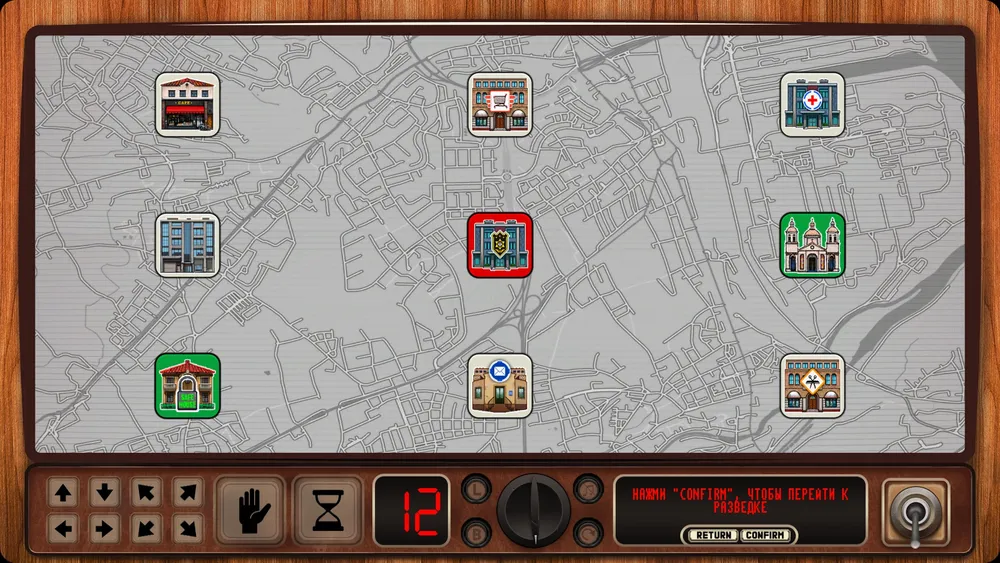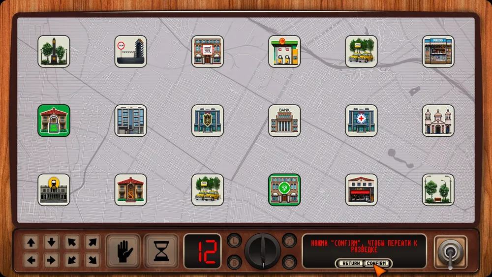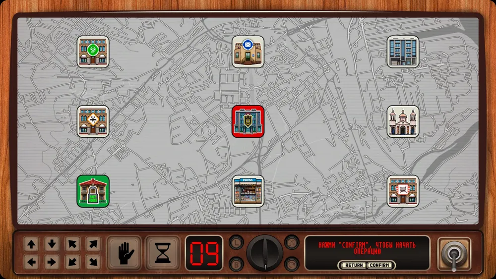 В следующей операции нужно установить жучек на работе подозреваемого, сменить батарейки у ранее подкинутого отслеживающего устройства и вернуться на явку. В этот раз на карте будут попадаться трамвайные остановки. Став на такую клетку и нажав кнопку «Confirm», агент переместится на другую остановку.