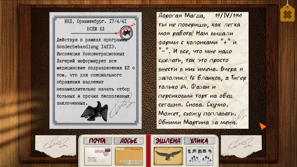Теперь предстоит найти связь между документами. В письме узнаем, что ранее подозреваемый и его друг ранее любили шифровать свои даты рождения и с помощью такого же шифра врачам СС присваивают специальные номера, кроме того, в письме указаны цифры в виде слов на латинском: unos (1), quattuor (4), septem (7). Заглянув в рапорт, можно понять, что цифры в конце документа означают тех самых врачей. Осталось только доказать, что подозреваемый входит в этот перечень. Чтобы разобраться какая цифра ему присвоена нужно ознакомиться с досье и обратить внимание на его дату рождения — 24.4.1902. Если сложить все цифры даты (2+4+4+1+9+0+2) получаем 22, складываем второй раз и получаем 4. Подчеркиваем слово quattuor из письма и (4) из рапорта. На этом завершается данный этап. Кликаем на часы и день заканчивается.