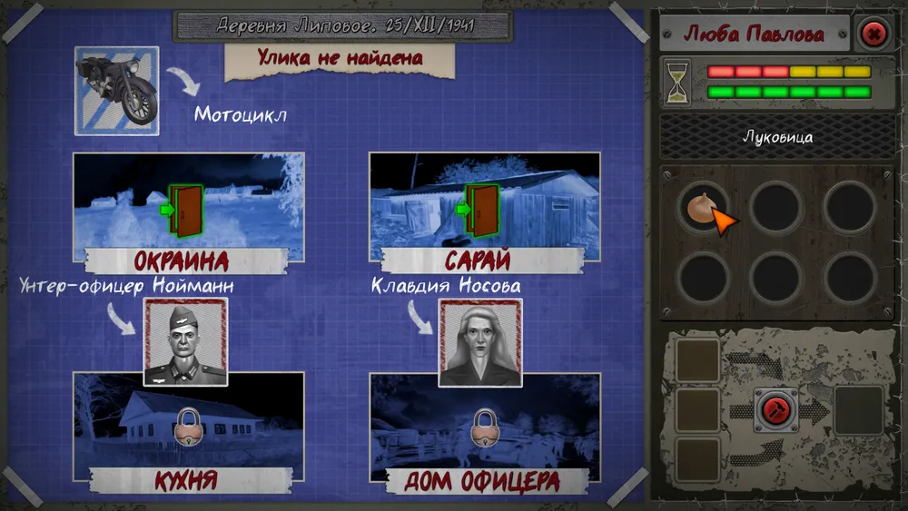 В первом квесте изначально имеется луковица. На окраине из пугала получаем мятый котелок и тупой кортик. Во дворе применяем кортик на мотоцикл чтобы получить железный ящик. Проводим его через комбинатор и получаем противогаз. В сарае применяем кортик на ящик и получаем фильтр. Комбинируем противогаз и фильтр чтобы поучить рабочий противогаз. Отдаем его тут же капитану Нильсу, взамен получаем сковородку и доступ к верстаку. На верстак применяем мятый котелок чтобы починить его, после чего отдаем его унтер-офицеру Нойманну, получаем оселок и доступ к кухне. Там рядом с печью подбираем уголь. Оселком затачиваем кортик. Комбинируем кортик и лук чтобы получить резанный лук. Комбинируем его и сковородку, после чего получившийся комплект применяем на печь, в итоге получаем жаренный лук. Отдаем его Клавдии Носовой, взамен получив хлеб и доступ в дом офицеров. В доме отдаем хлеб лейтенанту Краузе, после чего открывается доступ к сейфу и столу. Из стола подбираем планшет, комбинируем его с углем и получаем шифр. Применяем шифр на сейф и достаем из него пистолет. Отдаем его партизану Егорову на окраине и получаем заветную улику.