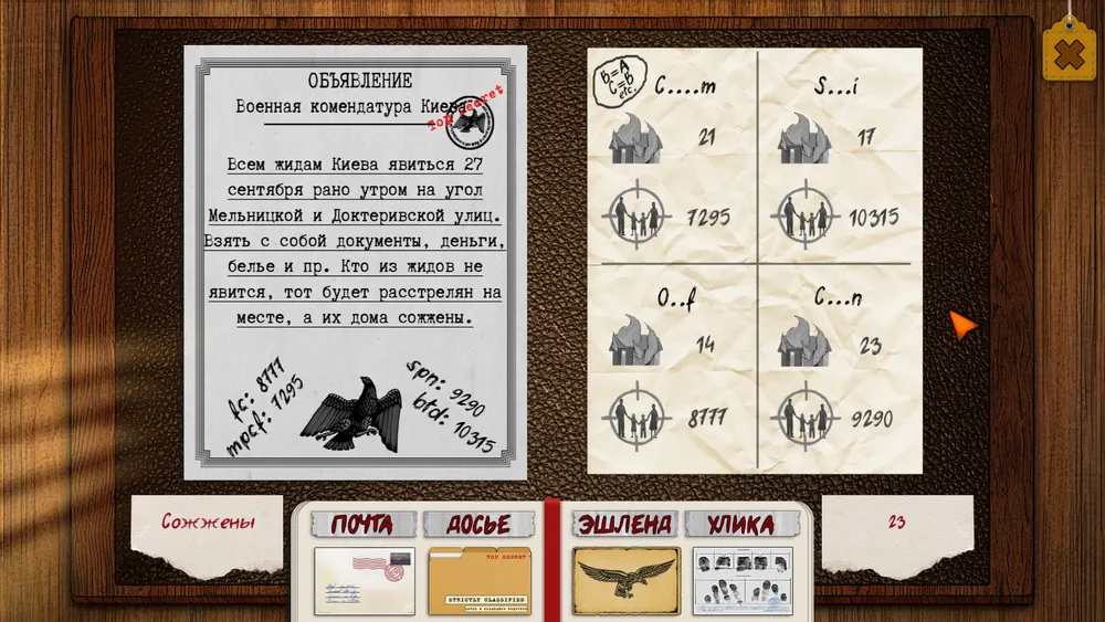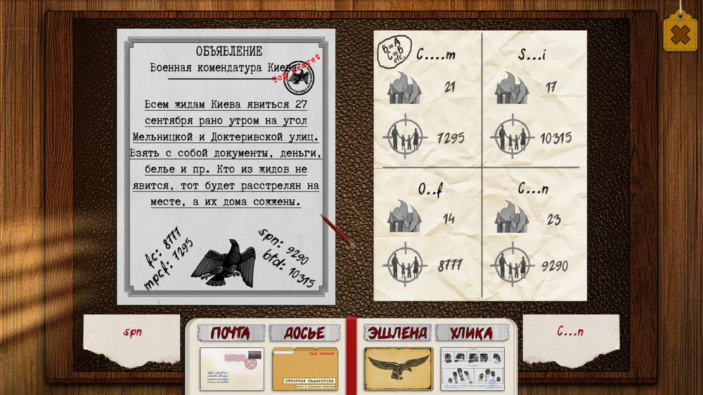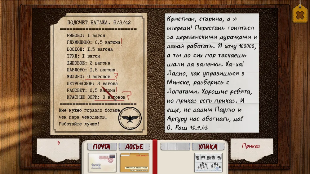 Опросив свидетеля, переходим к анализу еще одних документов. В тексте почетной грамоты примечаем слово айзацгруппы, которым помогал награждённый. А в письме, где упоминается имя подозреваемого, говориться, что он помог с «особыми грузовиками», помечаем слово грузовики. Все, доказательство найдено. На этом очередной день заканчивается.