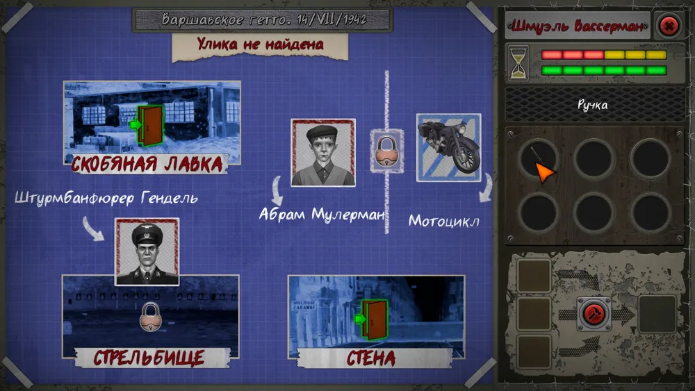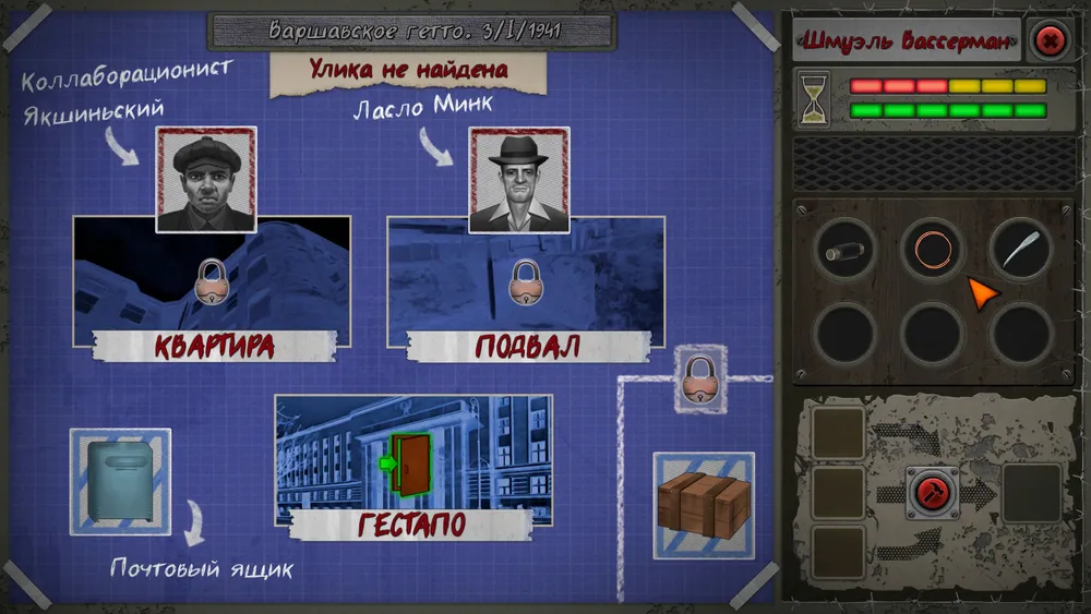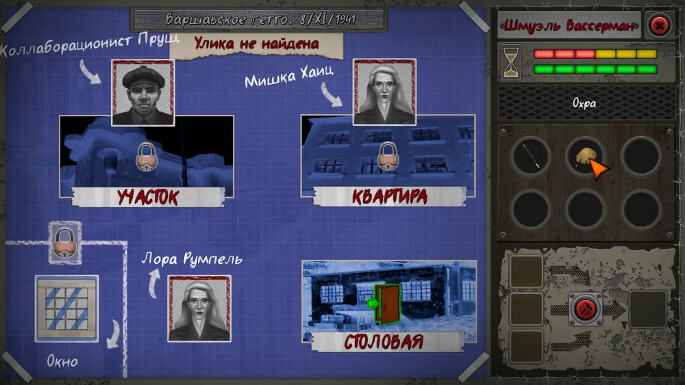 Далее, очередной опрос свидетеля. У героя в инвентаре имеются охра и ручка. Первым делом идем в столовую и забираем из стола тюбик вазелина и жир. Комбинируем их с охрой, итогом получим помаду. Её нужно отдать во дворе Лоре Румпель, взамен получим крючок и чистый бланк. Комбинируем бланк с ручкой тем самым получаем записку. Отдаем её коллаборационисту Прущу и получаем доступ в участок. Крючок применяем на окно и получаем лист бумаги. Идем в столовую и применяем его на печи, чтобы получить послание. Отдаем его Мишки Хаиц и получаем большую коробку и доступ к квартире. Тут на верстаке разбираем коробку и получаем футляр. Его проводим через комбинатор предметов тем самым распаковываем украшение. Отдаем украшение Камалю Гроту и зарабатываем нелегальную валюту. Её отдаем штабс-ефрейтору Мунку в столовой и получаем униформу. Ту в свою очередь относим в участок Абелю Перельману, чтобы добраться до нужной улики.