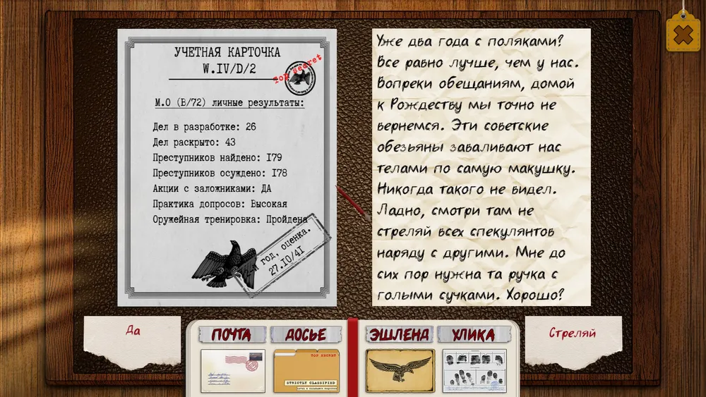 Теперь нужно сопоставить документы. На этот раз одного совпадения не хватит нужно найти еще дополнительное. Первую пару слов можно заметить, прочитав предложение, где говориться, что подозреваемый уже второй год работает с поляками. Подчеркиваем слово «поляками», в документе видим печать «2-й год, оценка» с датой и подчеркиваем её. Второе совпадение можно заметить в предложении «… не стреляй всех спекулянтов», подчеркиваем слово «стреляй» в документе видим раздел «Акции с заложниками: да», подчеркиваем слово «да». На этом, поиск улик заканчивается и еще один день завершается.