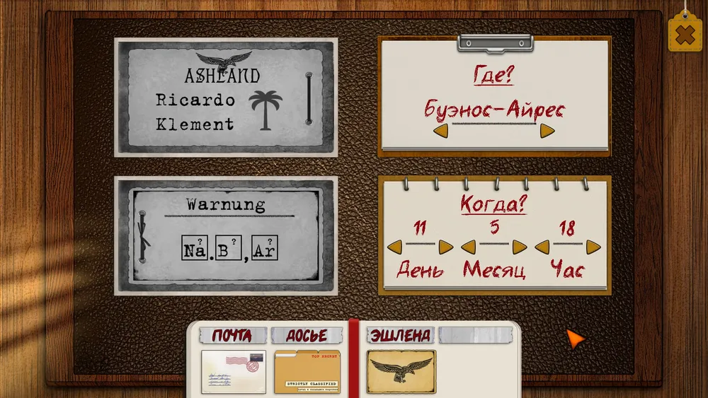 После операции по задержанию необходимо разгадать новый шифр. В первой части имеется надпись «Ricardo Klemet», под таким именем в городе Буэнос-Айрес скрывался беглый нацист Адольф Эйхман. Во второй части представлены элементы из периодической таблицы Менделеева. По ней нужно определить атомарное число Натрия, Бора и Аргона. Получаем числа 11, 5, 18. В итоге определяем: Буэнос-Айрес, 11 мая 1960 год, 18:00. В этот день был задержан тот самый Адольф Эйхман сотрудниками израильского «Моссад».
