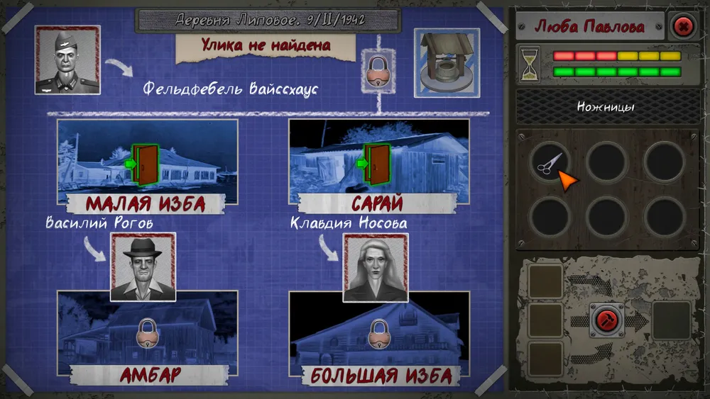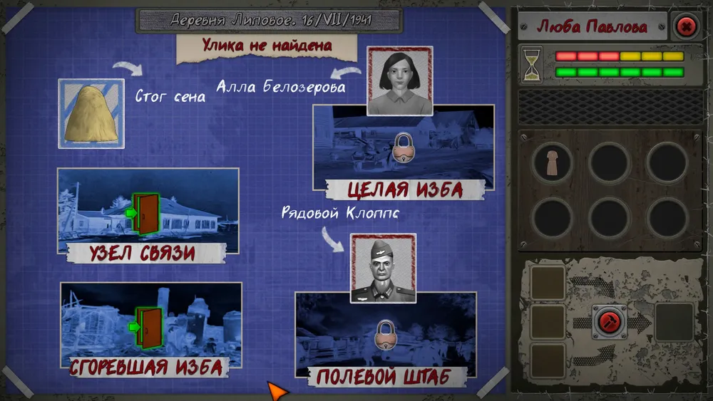 Следом идет очередной опрос свидетеля. В первом квесте в инвентаре лежит платье. Идем в узел связи и берем из стола табак. Теперь в сгоревшую избу и из печи достаем сгоревший сверток. Проводим его через комбинатор и получаем крестик. Отдаем его Алле Белозеровой и открываем путь к целой избе. В ней из кафа достаем газету. Проводим её через комбинатор чтобы получить полоски бумаги. Комбинируем полоски и табак, получаем сигарету. Отдаем её рядовому Клобсу и получаем дудочку и доступ в полевой штаб. Возвращаемся в сгоревшую избу и отдаем дудочку Ивану Загородько, взамен получаем ножницы и самогон. Самогон отдаем радисту Хейзеньергу, получаем аккумулятор и доступ к телеграфу. Из телеграфа забираем катушку. Аккумулятор и катушку комбинируем в магнит. Во дворе применяем магнит на стоге сена, чтобы найти иглу. Платье, ножницы и иглу комбинируем вместе и получаем брюки. Отдаем их майору Цвирсту в полевом штабе и получаем доступ к ящику. Из него берем хлеб и отдаем Вале Котову в целой избе и получаем нужную улику.