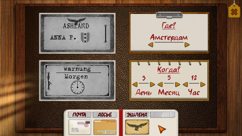 Далее, игроку нужно разгадать шифровку. На первой половине имеется надпись «Anna F.», по ней нужно понять место события. Данная подпись ничто иное как имя Анны Франк, её знаменитый дом-музей находится в Амстердаме. На второй части шифра написано слово «Morgen» и нарисован циферблат. Тут старый друг главного героя даст подсказку, что оно с немецкого переводиться как «завтра». Закрываем документы и смотрим на свое рабочее место. Тут замечаем часы с датой 2 мая. Следовательно, первые две цифры шифра 3 и 5. Третье число определяем по циферблату, т. е. ровно 12. Итого, в шифре указан Амстердам 3 мая 1960 в 12:00, в это время в Амстердаме официально был открыт дом-музей имени Анны Франк.