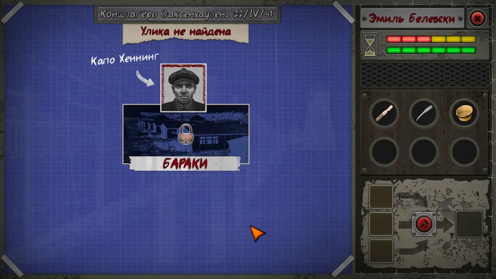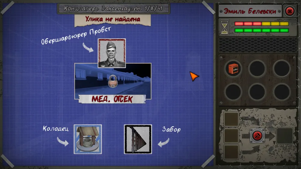В начале в инвентаре имеется папироса, черенок ложки и миска. Папиросу нужно отдать Капо Хенингу, после чего получаем доступ в бараки. В бараках щелкаем курсором по печи и получаем уголь. Складываем уголь, черенок ложки и миску чтобы получить «миску с измельченным углем». Отдаем её узнику Рудневу. После этих манипуляций открывается доступ к двум документам.