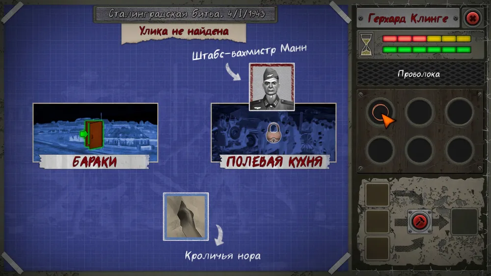 Во втором опросе в инвентаре уже будет проволока. Применяем её на кроличьей норе и достаем часы. Далее заходим в бараки и берем из шкафа веревку. Следующим делом возвращаемся во двор и отдаем часы штабс-вахмистру Манну, получаем доступ к полевой кухне. В ней возле ящика берем морковь и яд. Веревку и морковь комбинируем, а полученный комплект применяем во дворе к кроличьей норе. Поймав кролика, отдаем его повару Пирогову, взамен получаем мясо кролика и доступ к печке. Мясо нужно применить на стол, тем самым получаем резанное мясо. Его применяем к печке и получаем приготовленное мясо. Готовое мясо комбинируем с ядом, далее направляемся в бараки и отдаем отравленное мясо ротмистру Бломефельду. В результате получаем еще одну улику.