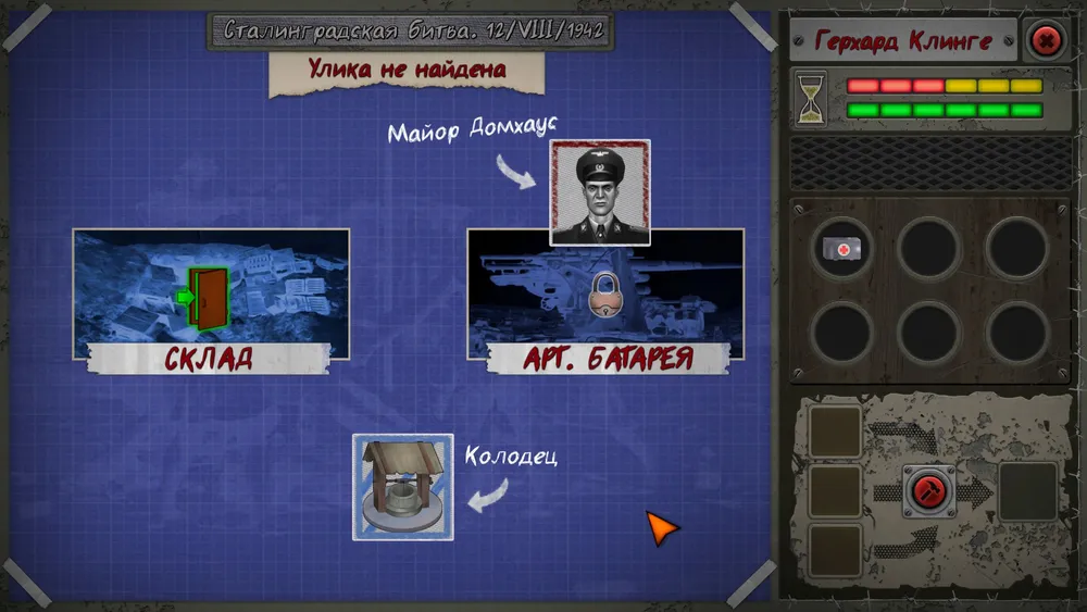 Следующим шаг, опрос свидетеля. В этом квесте изначально в инвентаре имеется сыр. Первым делом заходим в архив и берем мышеловку рядом с ящиком. Складываем сыр с мышеловкой и применяем полученный комплект к ящику, тем самым ловим мышь. Её отдаем Ивану Киррилову, взамен получаем книгу. Возвращаемся обратно во двор и отдаём книгу оберст-лейтенанту Шмидту, в ответ открывается доступ в полевой штаб. В штабе из стола получаем печать и сигареты. Сигареты разбираем при помощи комбинатора и получаем табак. Табак отдаем Алексею Вульфу, взамен получаем перьевую ручку. Снова идем в архив, применяем ручку на шкаф и получаем лист бумаги. Комбинируем лист бумаги с ручкой и печатью, результатом будет поддельный документ. Отдаем его обервахтмистру Круппсу и получаем заветную улику.