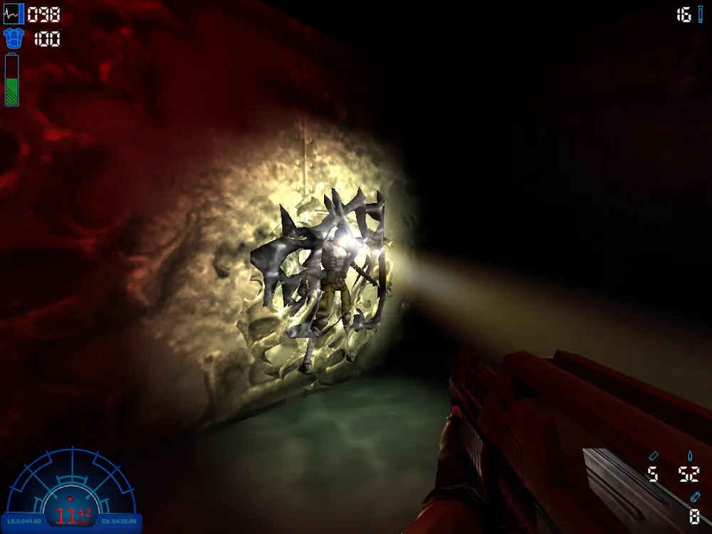 Идём вдоль правой стены и прыгаем вверх по... блин, как это назвать? Короче, вы поймёте, когда увидите. Осторожно, не упадите, иначе сваритесь в кислоте на "раз". Допрыгав до исходящего паром прохода, идите внутрь. Дальше просто идите вперёд, отстреливая ксеноморфов. В комнате с яйцами идите к туннелю прямо напротив входа. Чуть дальше туннель раздваивается; идите налево и в очередной комнате с яйцами вновь в туннель напротив входа. На развилке снова идём налево, по пути отстреливаясь от ксеноморфов. Дойдя до останков неизвестного космического корабля (или что это там?), идите в заполненный чёрной биомассой проход. Выход из следующей комнаты с ксеноморфами находится традиционно напротив входа. Идём дальше по туннелю, в вертикальной шахте прыгаем вверх по выступам, идём дальше. О, ещё одна арена! На этот раз наш враг - то ли молодая королева Чужих, то ли преторианец-переросток. В любом случае, битва не будет трудной: просто отступайте, повернувшись лицом к врагу и стреляйте из ракетницы. Можете даже совершенно невозбранно лечиться и восстанавливать энергию прямо на ходу. Когда противник будет повержен, на вас выбежет куча ксеноморфов - к этому времени крайне желательно иметь немалый запас энергии для ракетницы. Разобравшись с ними, восстановите энергию и здоровье и ступайте в пробитый проход.