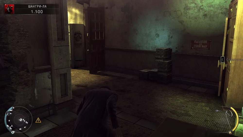 Подымаемся наверх, прижимаемся к правой стене, наблюдаем полицейского. (Вообще их на максимальной сложности их здесь трое).
