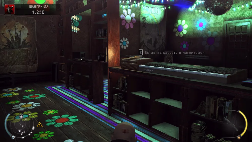Кстати на повышенной сложности уровнях здесь будет идти наверх полицейский. Спускаемся по лестнице и против часовой стрелки обходим за спины полицейских. Кстати в углу лежит шнурок, который может заменить удавку. Дожидаемся пока полицейский отправит подчиненного включать освещение. Свет в центре зала включается и полицейские направляются в центр зала: