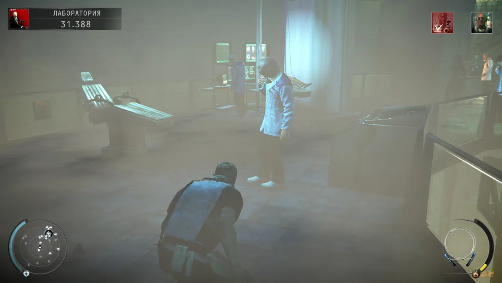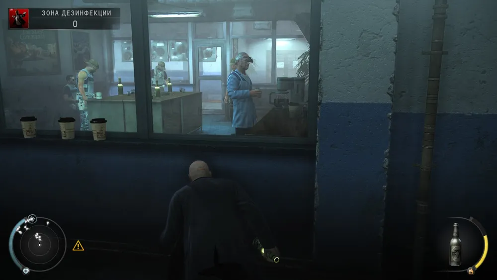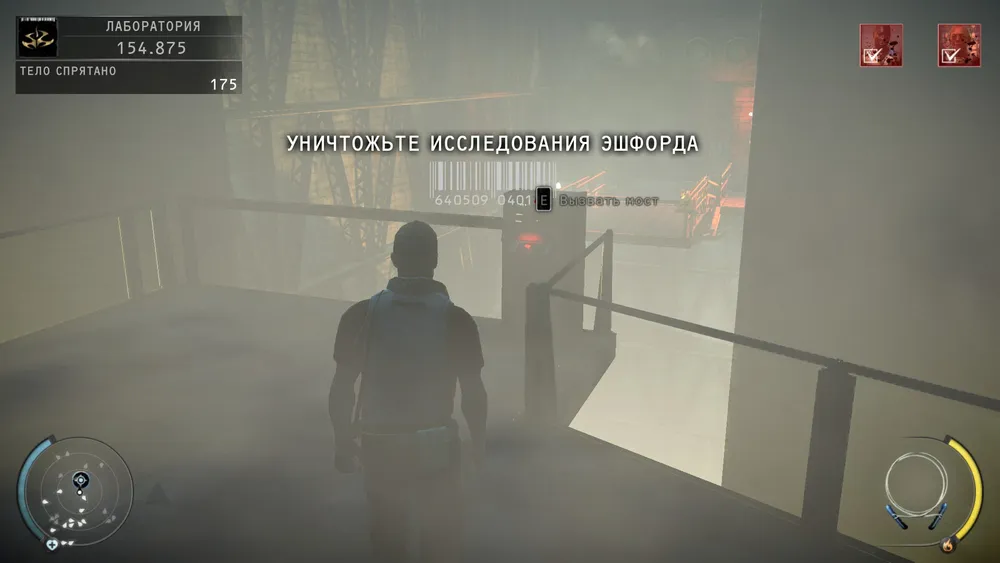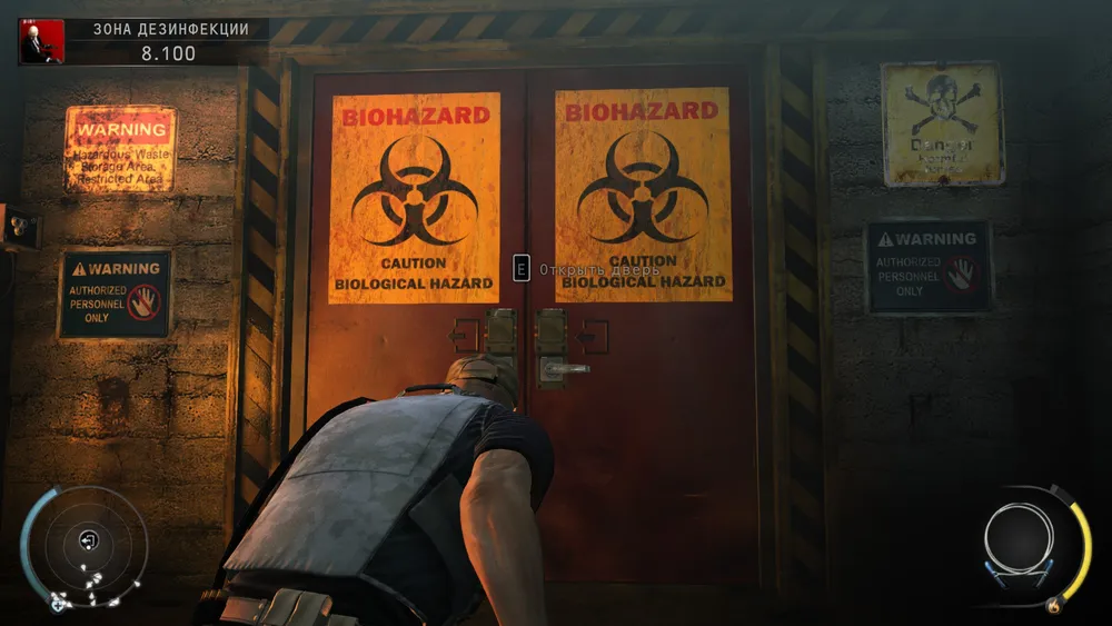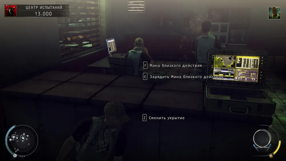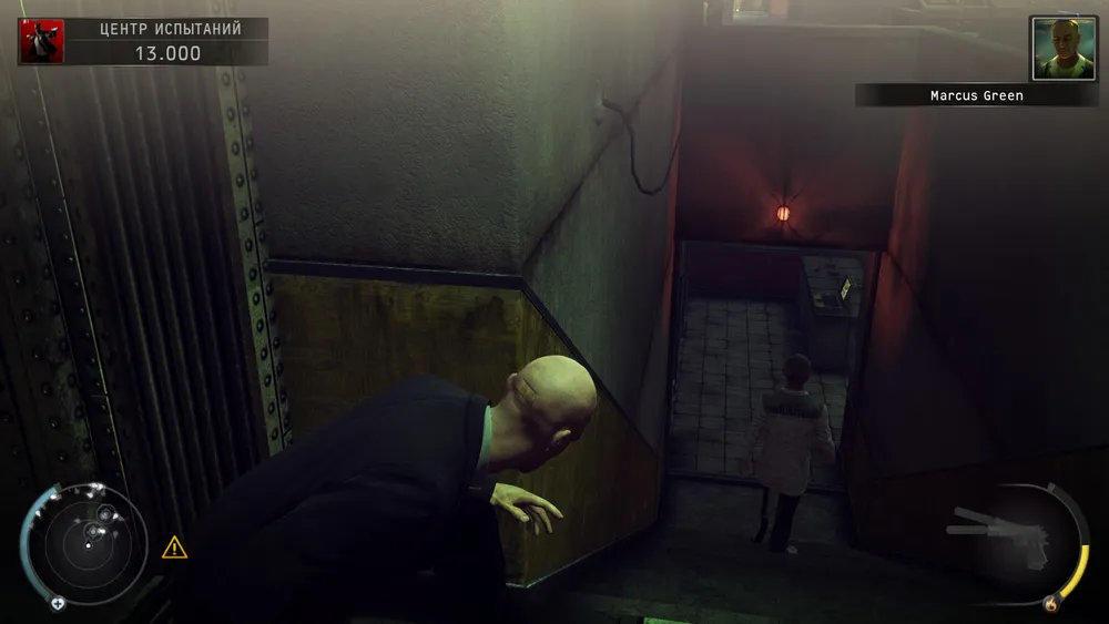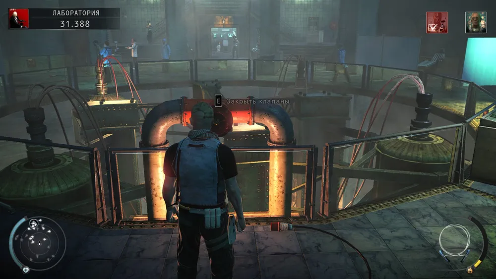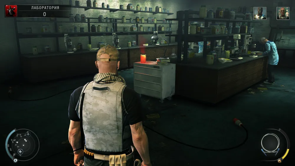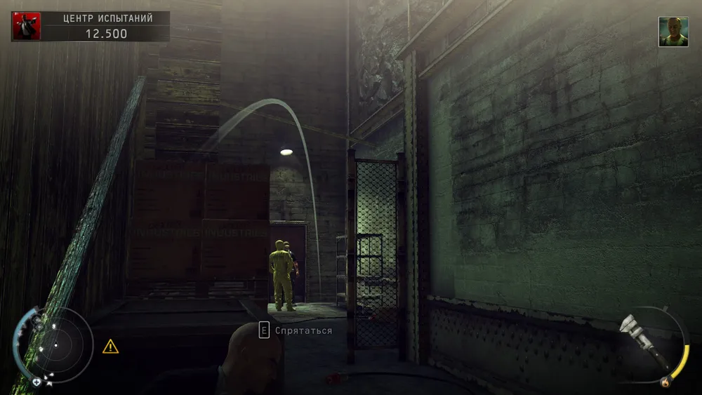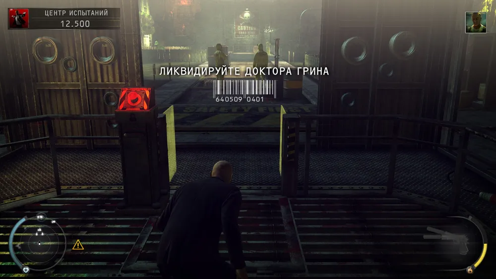 двигаемся до двух охранников, обсуждающих доктора Грина, дожидаемся когда один из них развернется
